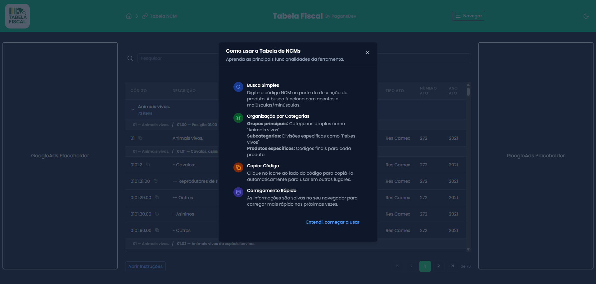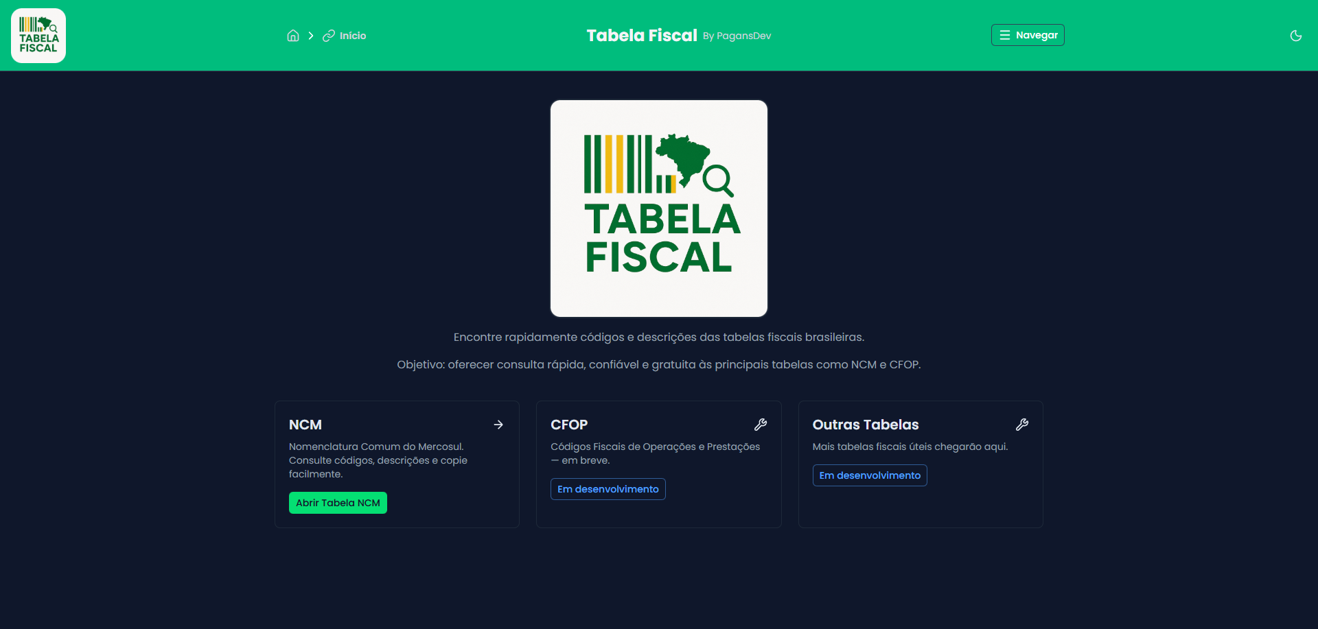 Aplicação web para consulta de tabelas fiscais como NCM e CFOP. A proposta do projeto nasceu de uma necessidade de consultar recorrentemente códigos de NCM para suporte no meu estágio. O sistema conta com um sistema de cache com IndexedDB para evitar requisições desnecessárias armazenamento dos capitulos dos códigos NCM. Também possui um sistema de busca para encontrar códigos de NCM de forma normalizada.
